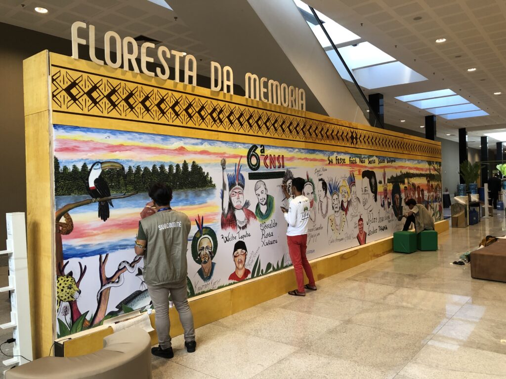 Além das salas modulares, no lobby do Piso 1 foi montado um imenso painel intitulado “Floresta da Memória” onde artistas desenharam e eternizaram importantes nomes da cultura indígena.